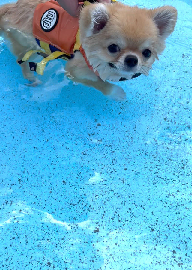 最初はドックランで歳の近いダックスちゃんと仲良く遊んでいたんですが、熱中症が心配だったので、プールに移動。最初はめっちゃ浅いところに入れてあげて、その後にちょっとだけ深いところで支えてあげながら遊んでいたんですが、前足をパタパタと動かしている姿がもう愛おしすぎて脳が溶けた(笑)。