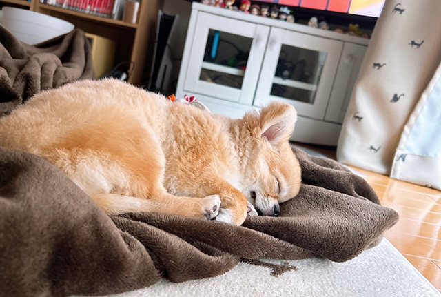 ドッグランで走ったあと、慣れないプールに入って疲れたのかな? お家に帰ったら爆睡。寝ている姿も愛おしいくて可愛いくてチュキ!