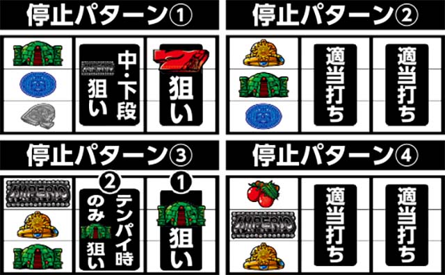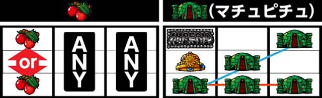左リール上段マチュピチュ停止時は、中リールの中・下段にBAR狙い→右リールに赤7を狙おう。マチュピチュをフォローしつつ、チャンス目A(ブランク・チェリー・赤7)・チャンス目B((ブランク・BAR・赤7)を1枚役として獲得可能だ。