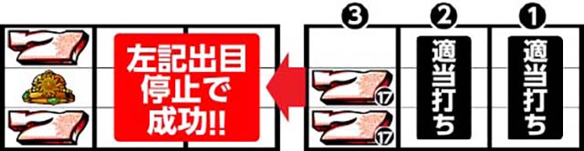逆押し適当打ち→左リール中・下段に17番の白7を目押しすればベルの入賞を避けることが可能だ。JACゲーム終了まで手順を実践し、JACゲーム終了→小役ゲーム中のベルなどでBIGが終了すればRT突入となる。