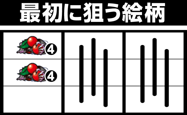 まず左リール上・中段に4番のチェリーを狙おう(邪眼絵柄を目安に)。