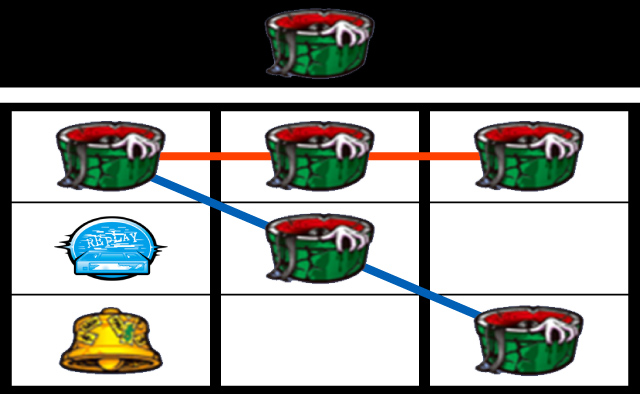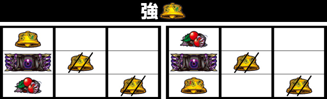 左リール下段チェリー停止からの右下がりベル揃い、左リール上段チェリー停止からの小山ベル停止で強ベルとなる。