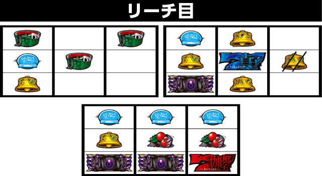 邪眼チャレンジ発生時は、リール右の邪眼ランプが点滅。全リールに邪眼絵柄を狙い、邪眼絵柄が揃えばボーナス確定となる。