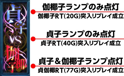 BIG後のバーサスチャレンジ(20G)中は3種類のRT突入リプレイ(伽椰子RT・貞子RT・貞伽椰RT)成立の可能性があり、成立時はリール左横の「貞子vs伽椰子ランプ」で告知される。