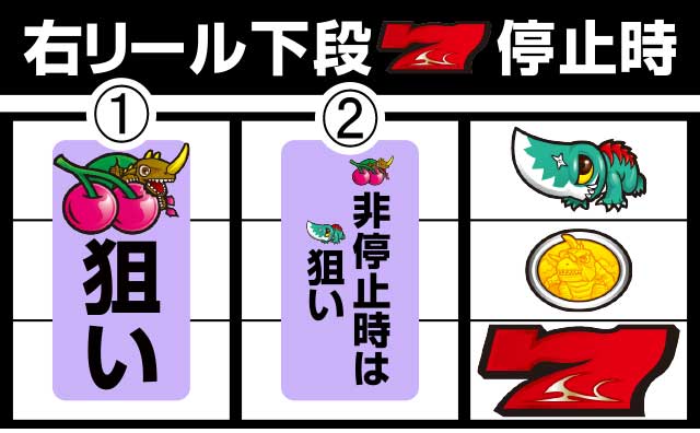 右リール下段に赤7が停止した場合は下記の手順でチェリーとギロンをフォローしよう。