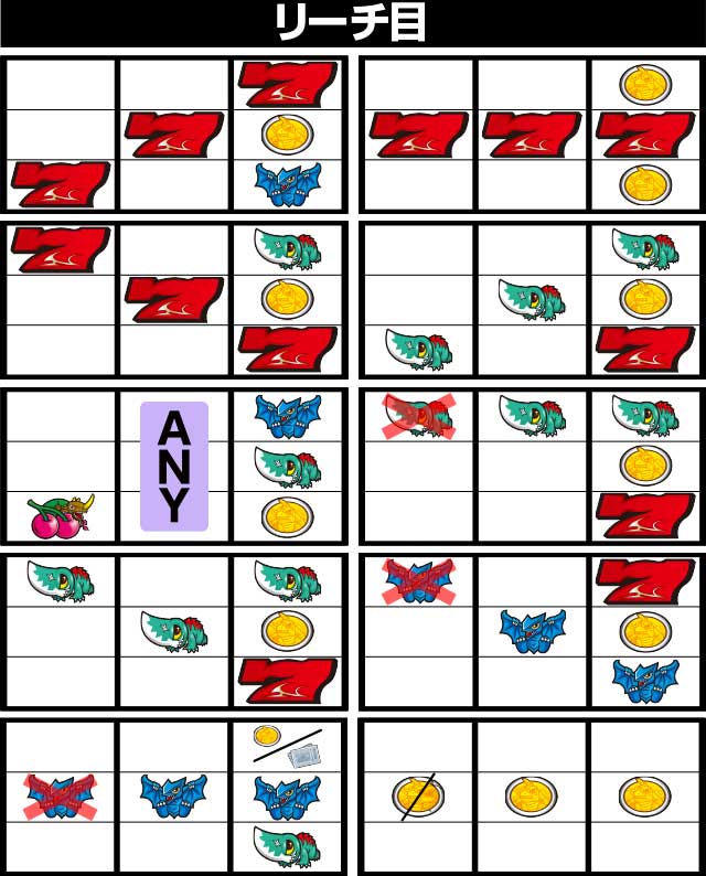 リーチ目の停止形は複数存在し、赤7揃いと右上がりギロン揃いのリーチ目はBIG濃厚となるぞ。