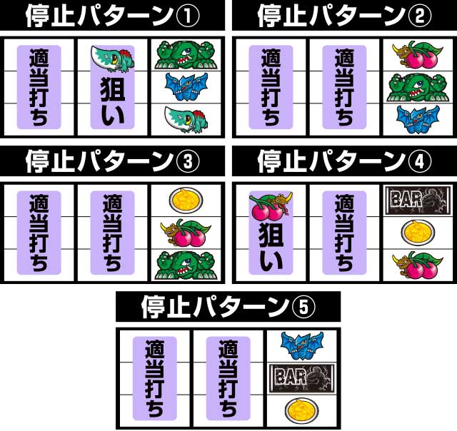 右リール上段ガメラ停止時は中リールにギロンを狙い、右リール上段BAR停止時は左リールにチェリーを狙おう。それ以外の停止形は適当打ちでOKだ。