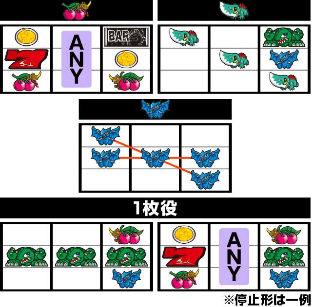 1枚役の停止形は複数存在。また、上記の1枚役はリーチ目とはならないので注意しよう。
