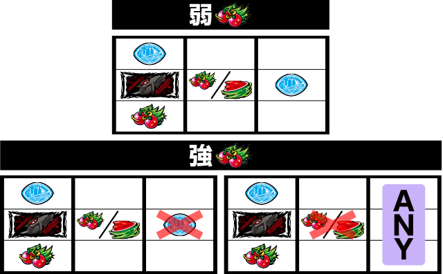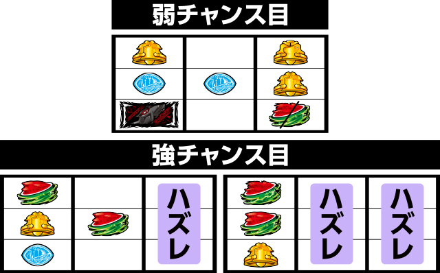 チャンス目フラグは2種類(弱・強)存在し、それぞれの停止形は上記の通り。なお、チャンス目入賞時は必ずリールフラッシュが発生する…という特徴アリ。