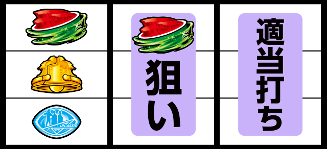左リールに「スイカ・ベル・リプレイ」が停止したらスイカ成立の可能性があるため、中リールはスイカ狙いで消化しよう(右リールは適当打ちでOK)。その他の停止形は適当打ちで消化しても問題ない。