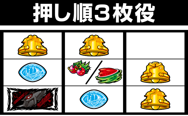 押し順3枚役は押し順正解時のみ入賞し、小役狙い手順実践時は上記の停止形をとる。