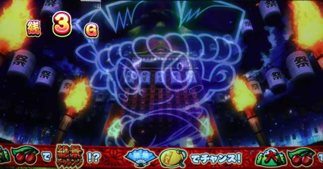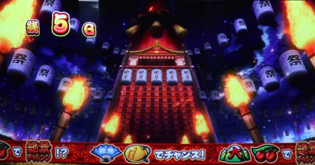第1停止or第3停止時に提灯が点灯し、絶景チャレンジ当選を示唆している(点灯数が多いほどチャンス)。