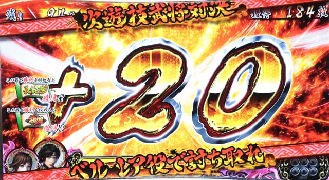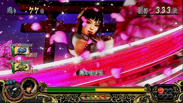 武将対決の稲姫は出現時点で勝利確定となるが、出現時に押し順ナビが発生しなければレア役成立、かつゲーム数上乗せが確定する。