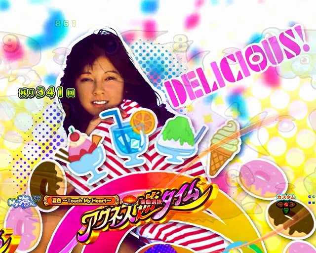 また、実写のアグネス・ラムカットイン予告やアグネス魚群予告も奇数図柄揃い濃厚。ビッグバイブ発生時にブラックアウトするとアグネスボーナス!?