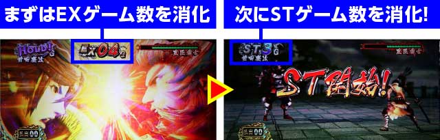 消化中は液晶上部中央に「EXゲーム数(5G固定)」、左上に「STゲーム数(4Gスタート)」が表示され、EXゲーム数を消化した後にSTゲーム数を消化する流れとなる。