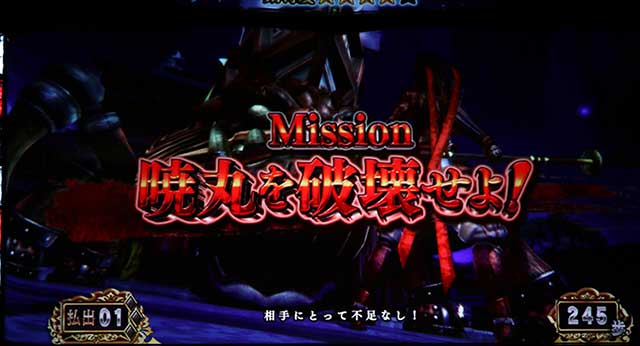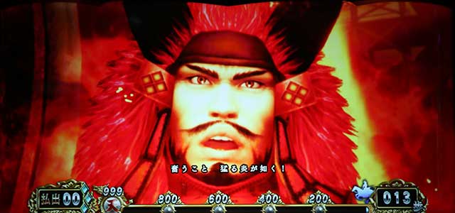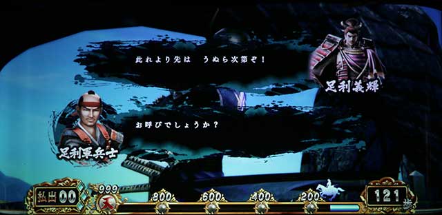 前兆ステージ移行前は必ずプレ前兆を経由。プレ前兆中は様々な演出で液晶がザワつくのだが、同系統の演出が連続した場合は本前兆期待度がアップ、足利軍兵士のセリフ演出(上の写真参照)が連続した場合は本前兆濃厚となる。