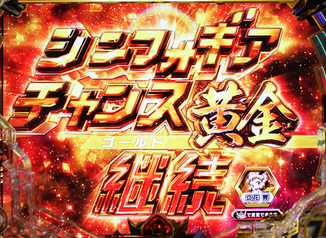 時短6or250回転+残保留1個のシンフォギアチャンス黄金は継続率87.7%の連チャンモード。演出は回転数に対応した4パートに分かれている。