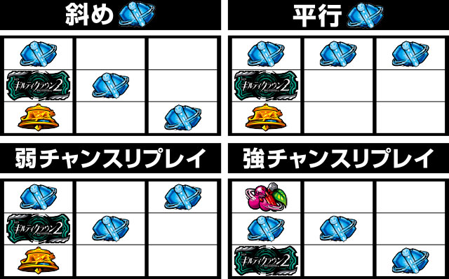 リプレイの停止形は全部で4種類し、基本的に入賞するのは「斜めリプレイ」だ。斜めリプレイ以外の停止形はRT状態移行に深く関与しており、入賞すると別のRT状態に移行していく(※)。