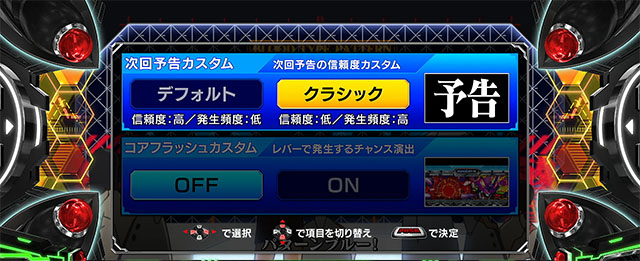 | コアフラッシュカスタム | ONにするとレバーON時にコアフラッシュ発生でボーナス期待度34.2%(コアフラッシュ発生率…1/94.4) | |