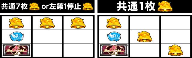 小役狙い手順実践時の停止形は2パターンとなっており、上段ベル揃いなら共通7枚ベルor押し順ベル、右下がりベル揃いなら共通1枚ベルだ。