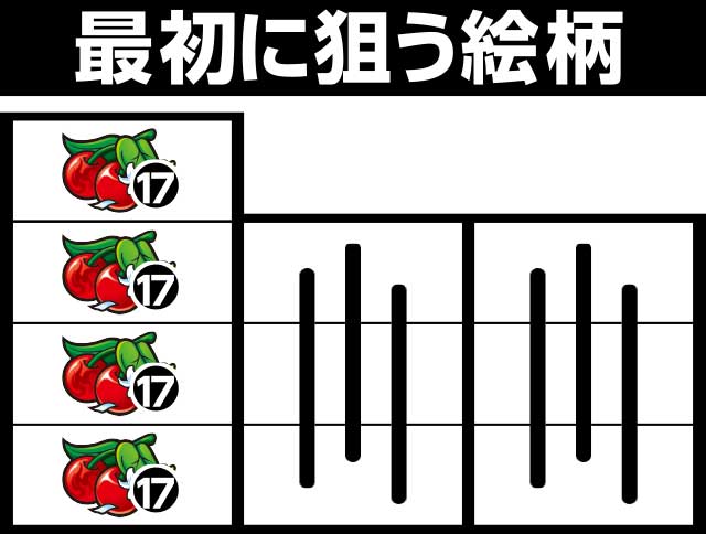 まずは左リール枠上〜下段に17番のチェリーを狙おう(BARを目安に)。