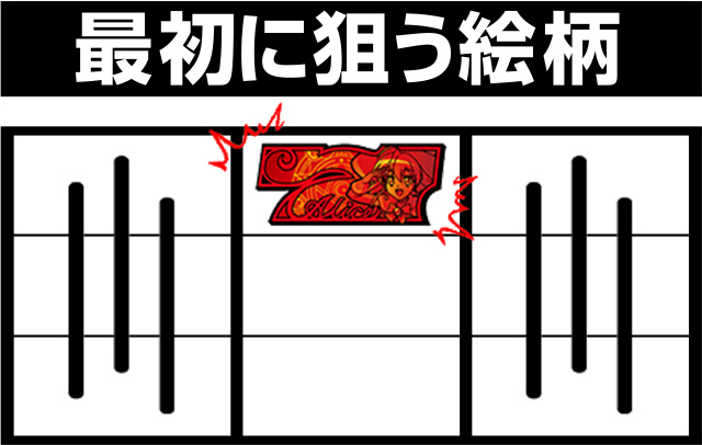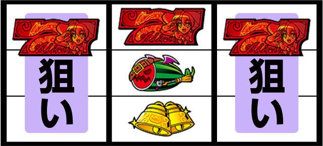 中リール上段に赤7が停止した場合はボーナス1確となるが、スイカ同時当選の可能性もあるため、左・右リールに赤7を狙ってスイカと赤7BIGをフォローしよう(どちらも否定した場合は次ゲームにREG狙い)。