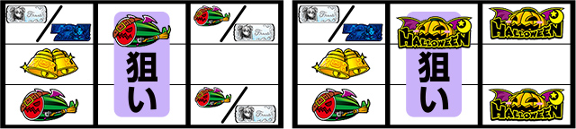 スイカがテンパイした場合は中リールにスイカを、スイカの対角線上にカボ絵柄が停止した場合は中リールにカボ絵柄を狙えば、スイカとリーチ目1枚役を同時にフォローできるぞ。