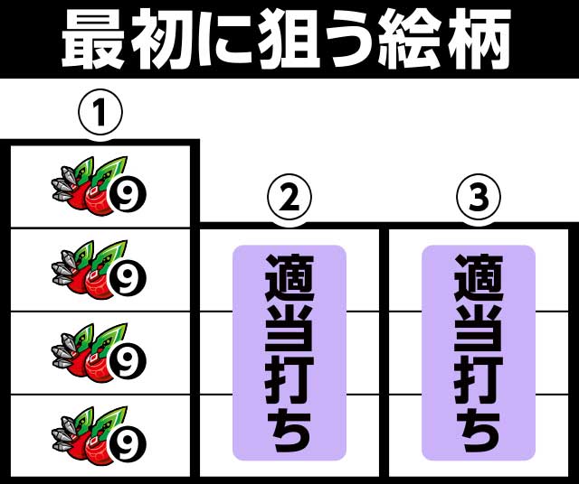 まずは左リール枠上〜下段に9番のチェリーを狙い(BARを目安に)、残りのリールは適当打ちで消化すればOKだ。