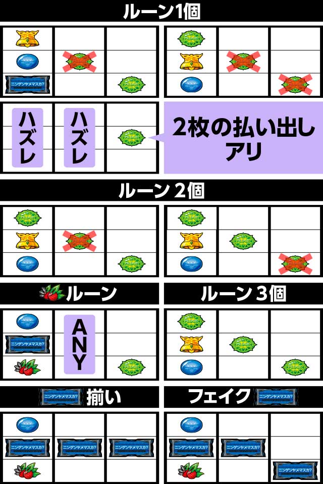 ルーン1個の停止パターンは3種類存在し、弱レア役的な役割を持っている。