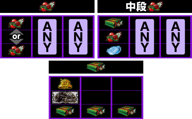 チェリーフラグは1種類のみで、中段チェリーはリーチ目フラグとなっている。また、角チェリーからのリプレイ揃いやスイカ揃いもリーチ目フラグとなるぞ。