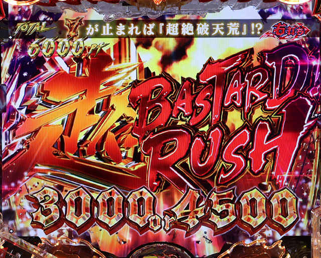 超バスタードRUSHはST回数、継続率ともにバスタードRUSHと変わらないが、大当り振り分けが大きく変化。大当りすれば必ず3000個以上、さらに約30%で4500個…と破壊力バツグンの破天荒RUSHに変貌するのだ!