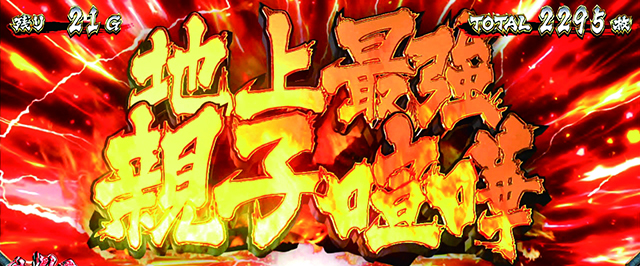 そして、5セット継続ごとに「地上最強の親子喧嘩」へ突入する可能性アリ。地上最強の親子喧嘩は1セット15G継続する純増5.2枚/Gのスペシャルボーナスで、最大10セット継続。