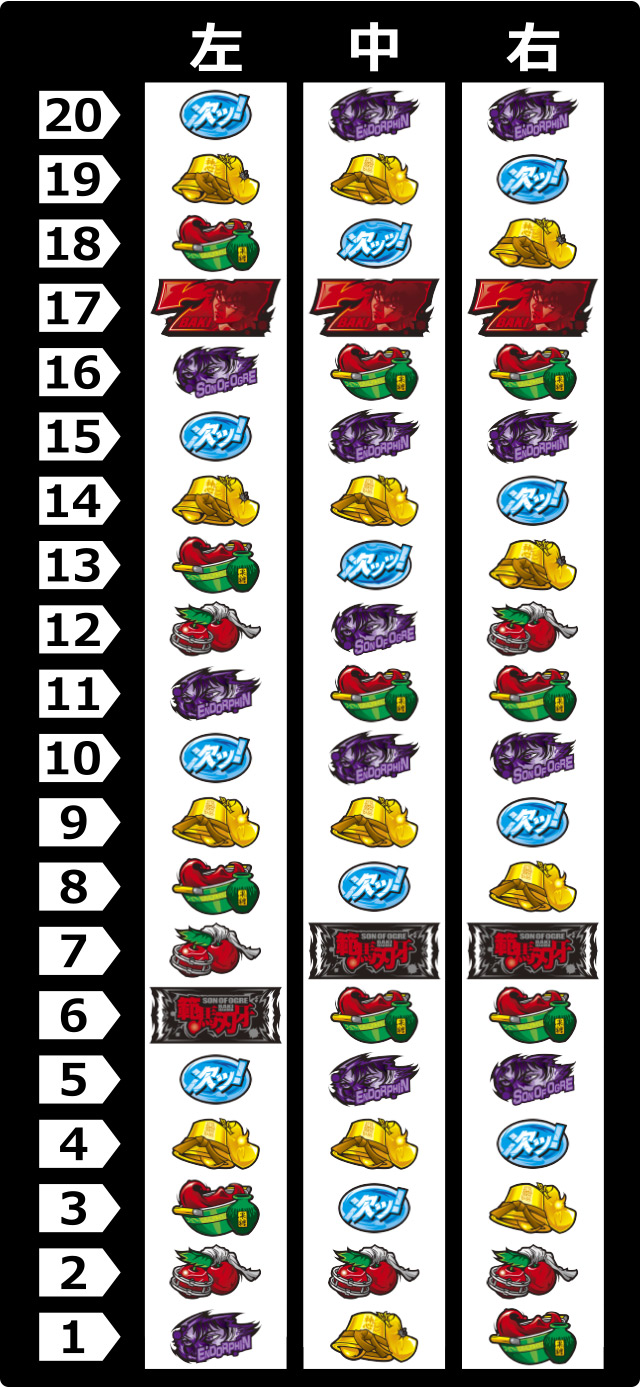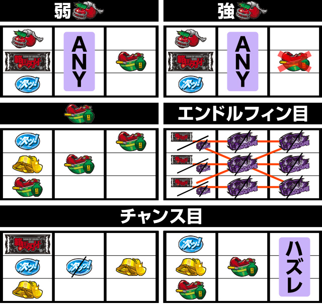 エンドルフィン目はどのラインでも入賞する可能性があり、押し順ナビを伴って入賞することも。