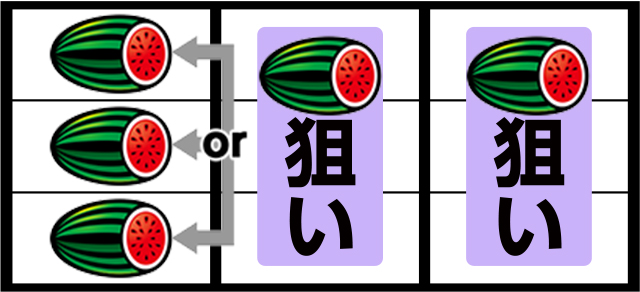 左リール枠内にスイカが停止した場合は中・右リールにスイカをフォローしよう。なお、スイカ成立時は必ず演出を伴う(スタンダードモードのみ)ため、演出非発生時は中・右リールを適当打ちで問題ない。