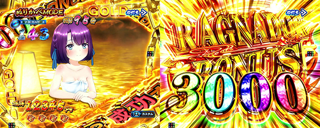 裏LTである「ラグナドRUSH GOLD」はSTの継続率こそ通常のLTと同じだが、大当り時は3000個以上の出玉を獲得するので、出玉増加速度が一気に加速!