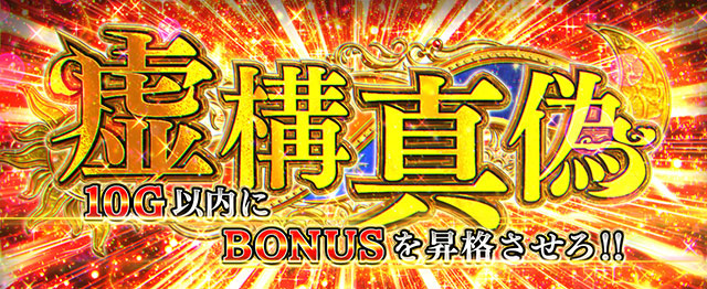 虚構真偽は10G+α継続するボーナス昇格CZで、小役成立時に成功抽選が行われる。成功期待度は約70%となっており、失敗しても「あやかしぼーなす」へ移行するぞ。