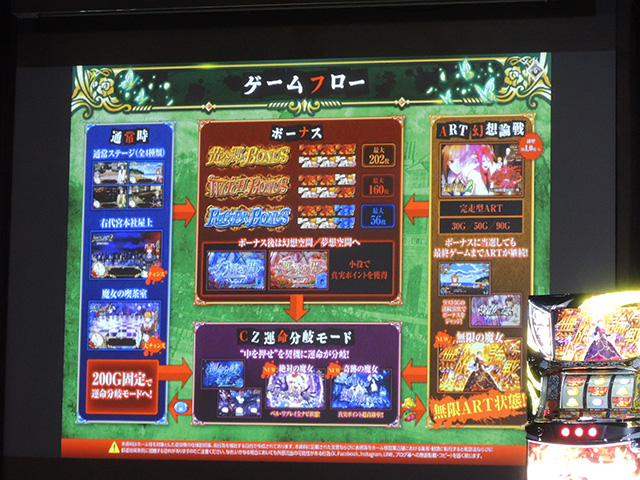 スペックは、リアルボーナス+ART機となっており、ボーナスは「黄金郷ボーナス(最大202枚獲得)」「ウィッチボーナス(最大160枚獲得)」「REG(最大56枚獲得)」の3種類存在し、ボーナス終了後はCZ「運命分岐モード」に移行。CZを成功すれば30or50or90G継続・純増約1.0枚/Gの完走型ART「幻想論戦」へ突入し、ARTの終盤ではボーナス成立か否かのジャッジ演出が発生する。
